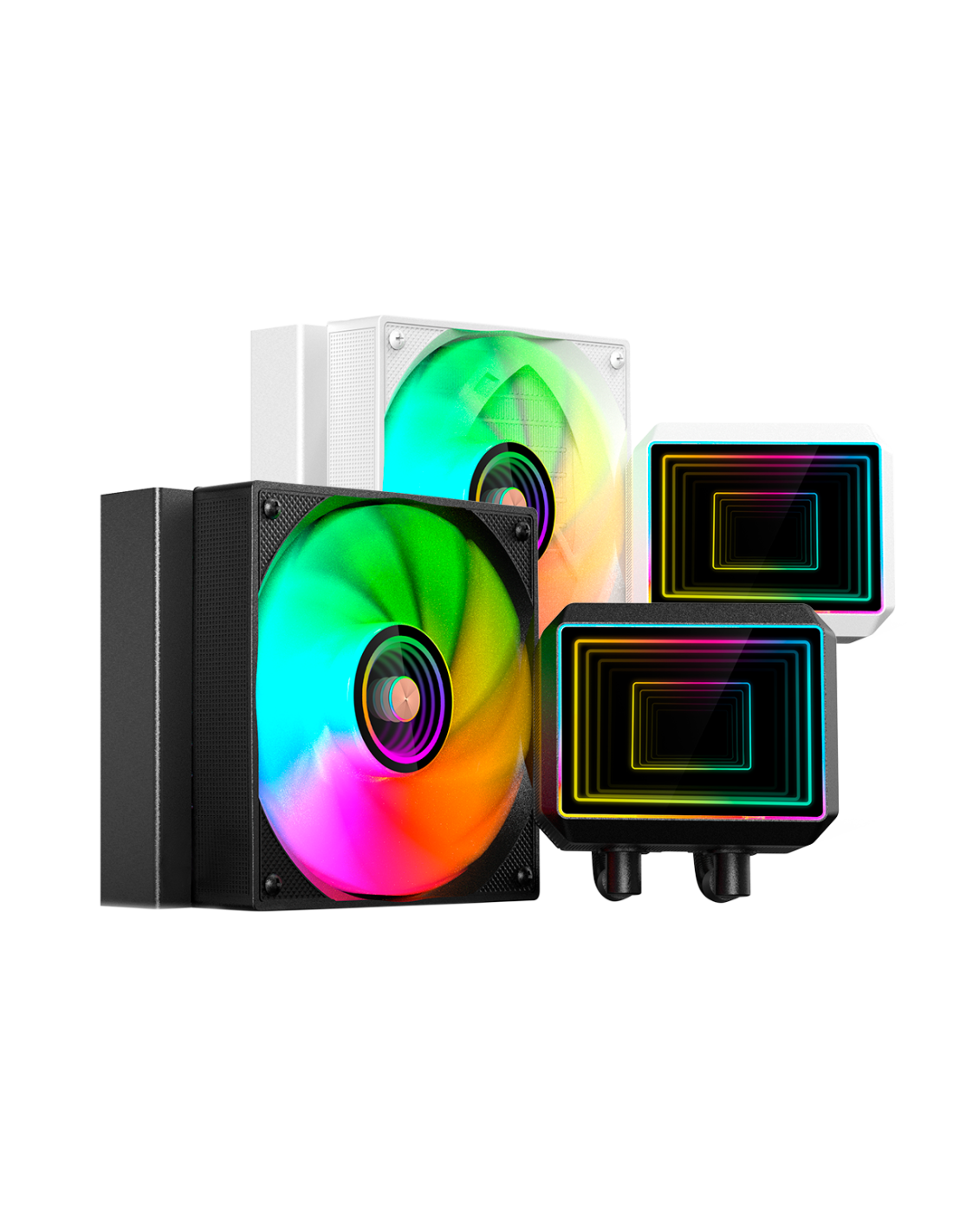 Die ML-TWO120 ist eine AIO-Flüssigkeitskühlungslösung, die ein Premium-ARGB-Design, modernste thermische Leistung und einen ultra-leisen Betrieb verbindet. Mit einer vierten Generation Pumpe aus Kupfer und Mikrokanälen, einem Kupferkern-ARGB-Ventilator, modernsten FDB-Lagern und einem Infinity-Mirror-Effekt sowohl im Kern als auch in den Ventilatoren, maximiert diese Kühlsystem nicht nur die Wärmeableitung, sondern transformiert auch die Ästhetik Ihrer Konfiguration. Kompatibel mit ARGB-Motherboards und CPUs mit bis zu 300W TDP, macht es Ihre Konfiguration maximal aus.