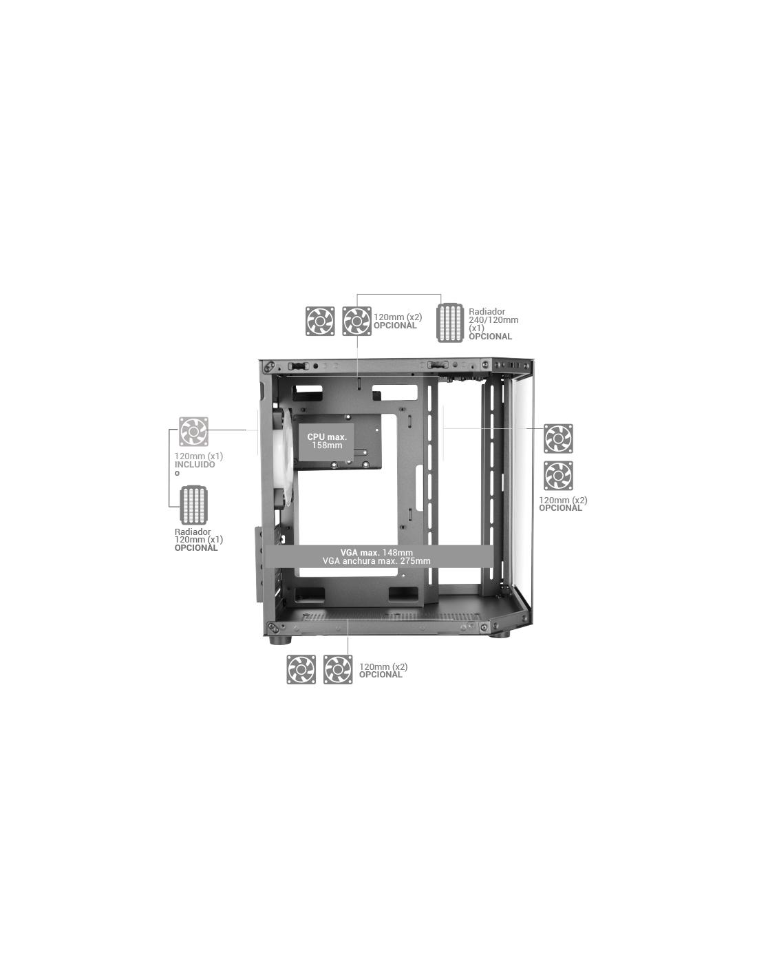 Sein kompaktes Microartx-Panoramik-Design mit drastischem Gehärtetem Glas, doppelter Kameras-Struktur und große interne Kapazitäten können Sie Ihre Hardware mit einer herausragenden thermischen Leistung zeigen. Mit dem Heckfan fRGB inklusive, Unterstützung für bis zu 7 flüssige Lüfter und Kühlungen bis zu 240 mm, ist es in der Mindestfläche für jede Herausforderung bereit