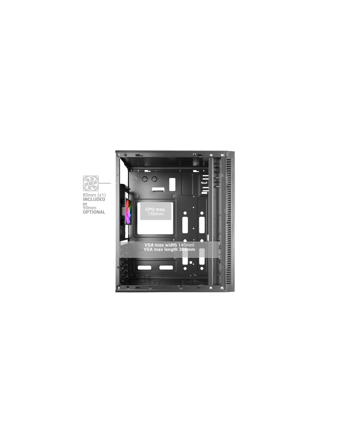 Mc-Blaze kombiniert modernes Design, Beleuchtung und thermische Effizienz und bietet ein perfektes Gleichgewicht zwischen Stil und Funktionalität. Seine Front mit LED-Streifen- und Full-Side-Fenster ermöglicht es Ihnen, jede Komponente mit einem sauberen und anspruchsvollen Finish anzuzeigen. Ausgestattet mit einem FRGB-Heckventilator und einem lateralen Lüftungsgitter garantiert es einen optimierten Luftstrom. Kompatibel mit ATX-Basisplatten, Micro-ATX und MINI-ITX, unterstützt die GPU von bis zu 300 mm und verfügt über 7 Erweiterungsschlitze, die maximale Vielseitigkeit in jeder Konfiguration gewährleistet.