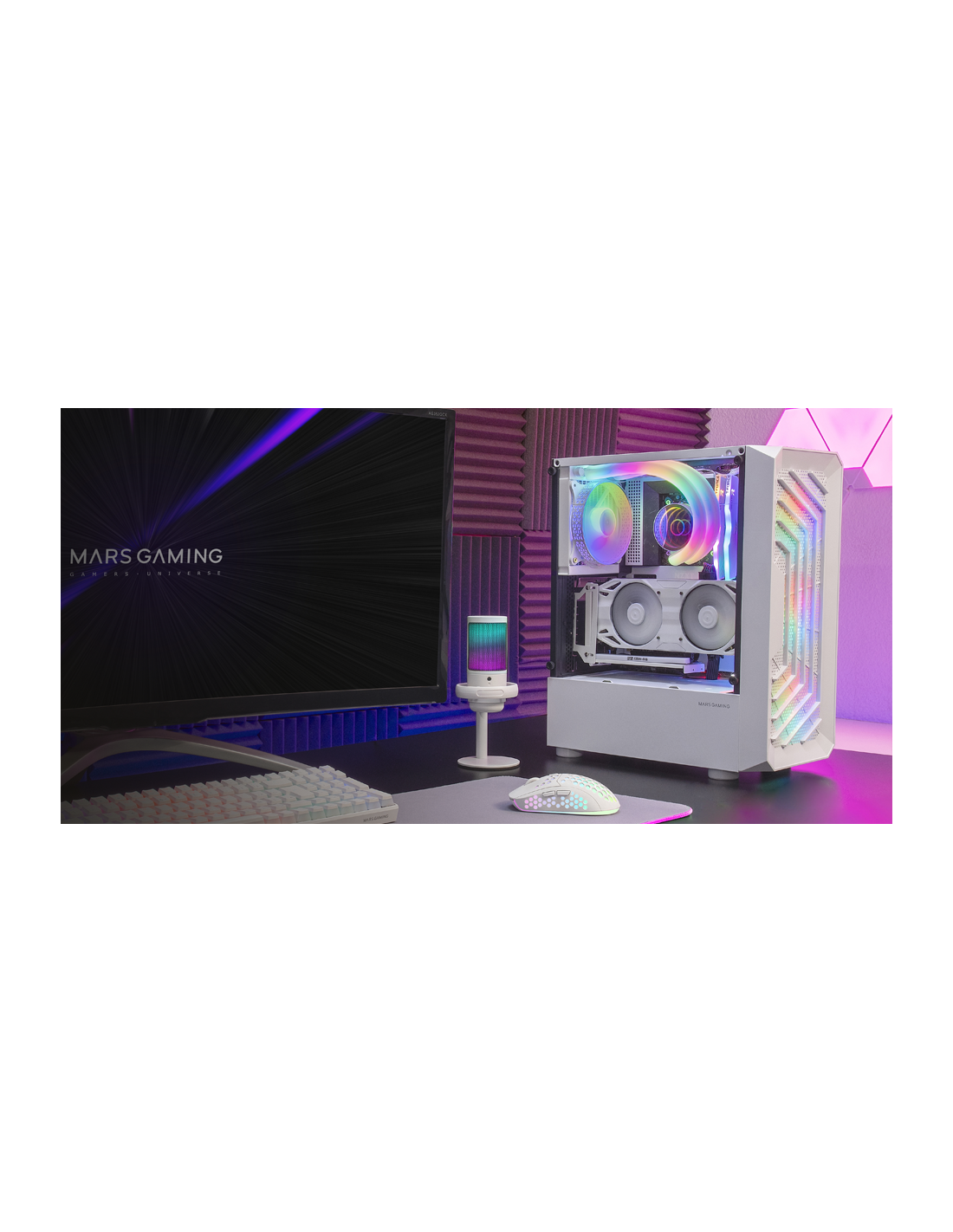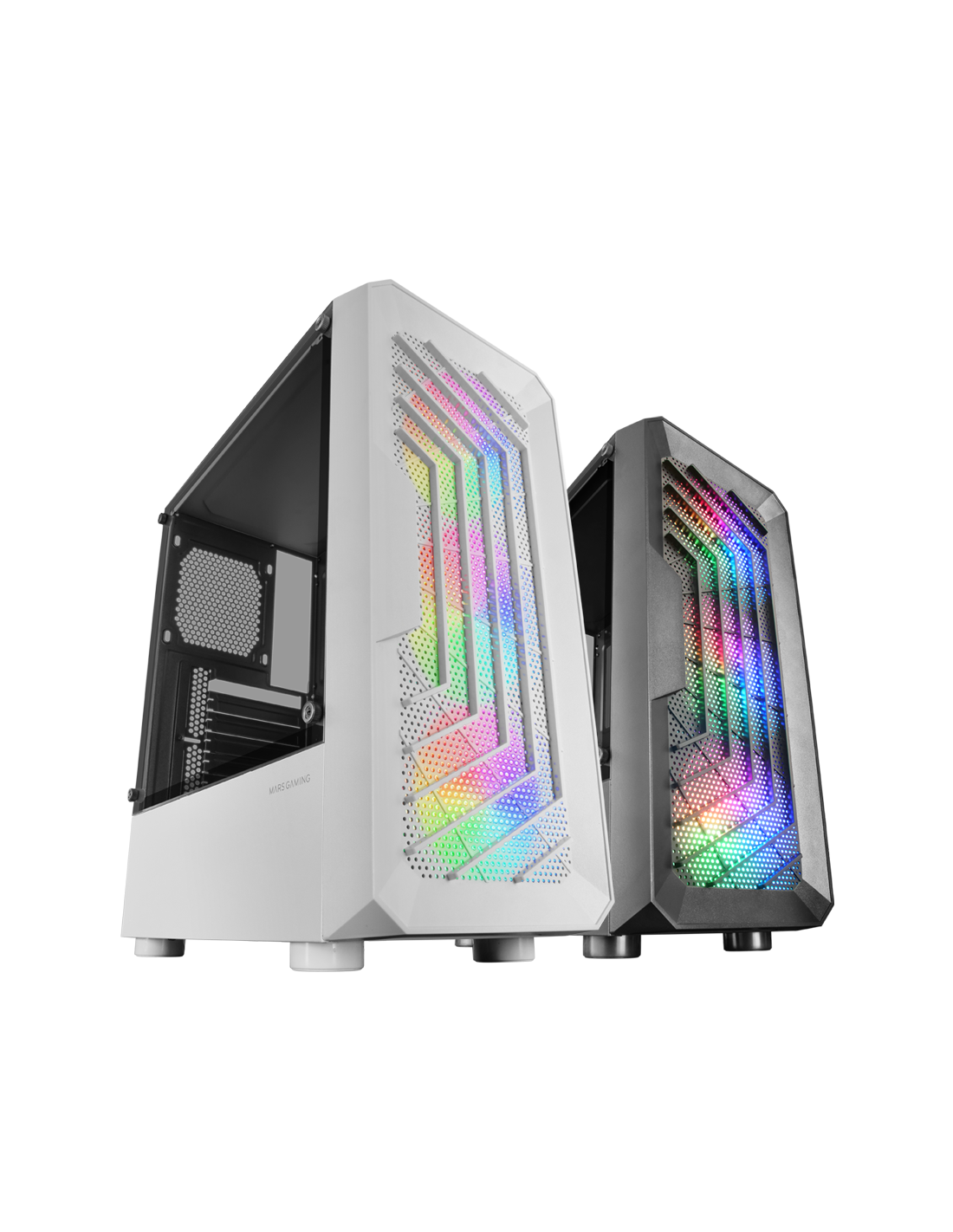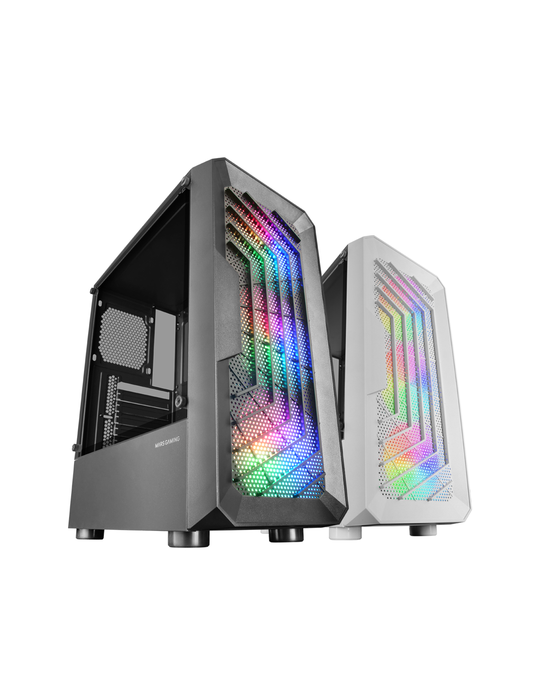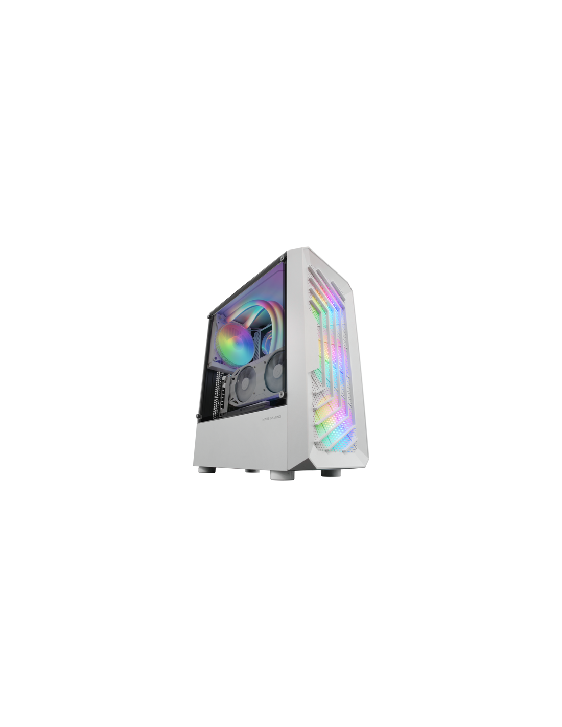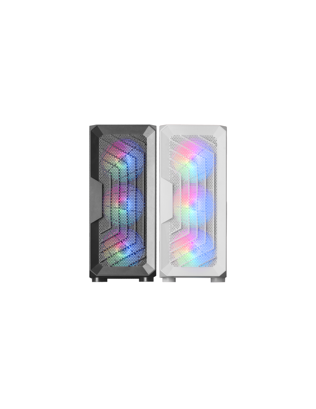 Frontales Mesh- und Dual-Kamera-Design. 3 120mm FRGB-Fans. Weitwarter Speicher für Festplatten. Flüssigkeitsraum von bis zu 240 mm und 306 mm Grafikkarten.