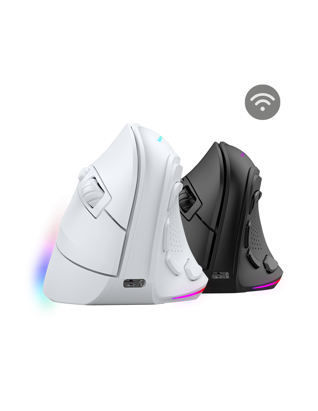 The MM-SK is a latest generation wireless vertical ergonomic tri-mode, created to offer maximum performance and comfort, either in intense games or long working hours. Its advanced vertical design reduces tension on the wrist and allows a natural hand posture, helping to protect your health even during prolonged sessions. With a versatile and ergonomic approach, the MM-SK is ideal for both immersive experiences in FPS games, MMO and MOBA, as well as for productive workflows. This mouse offers you everything you need: TRI-MODE connectivity, 9 programmable buttons and high precision sensor technology, combining power, customization and style on a single device.