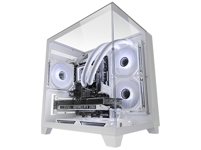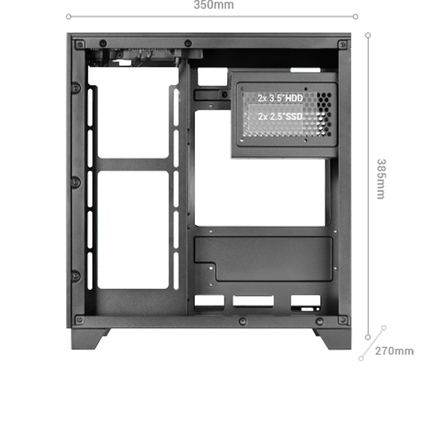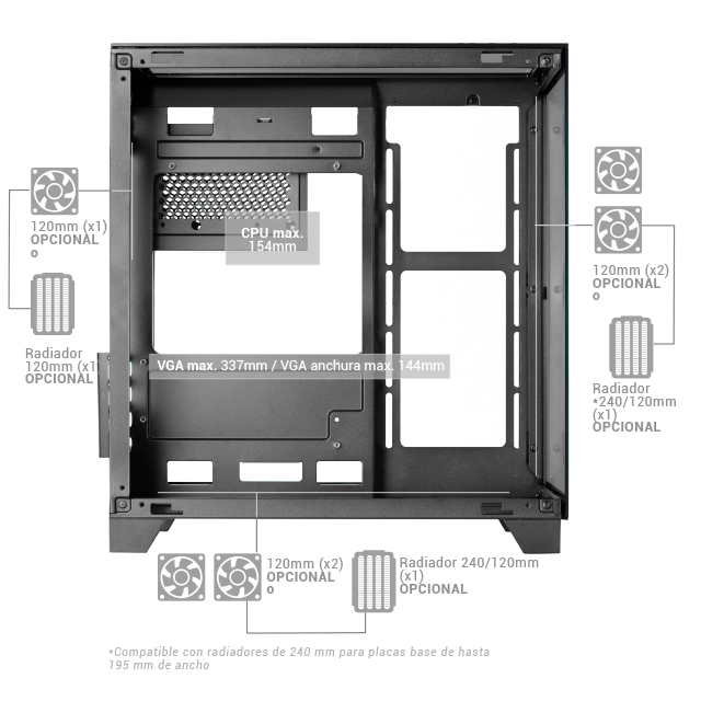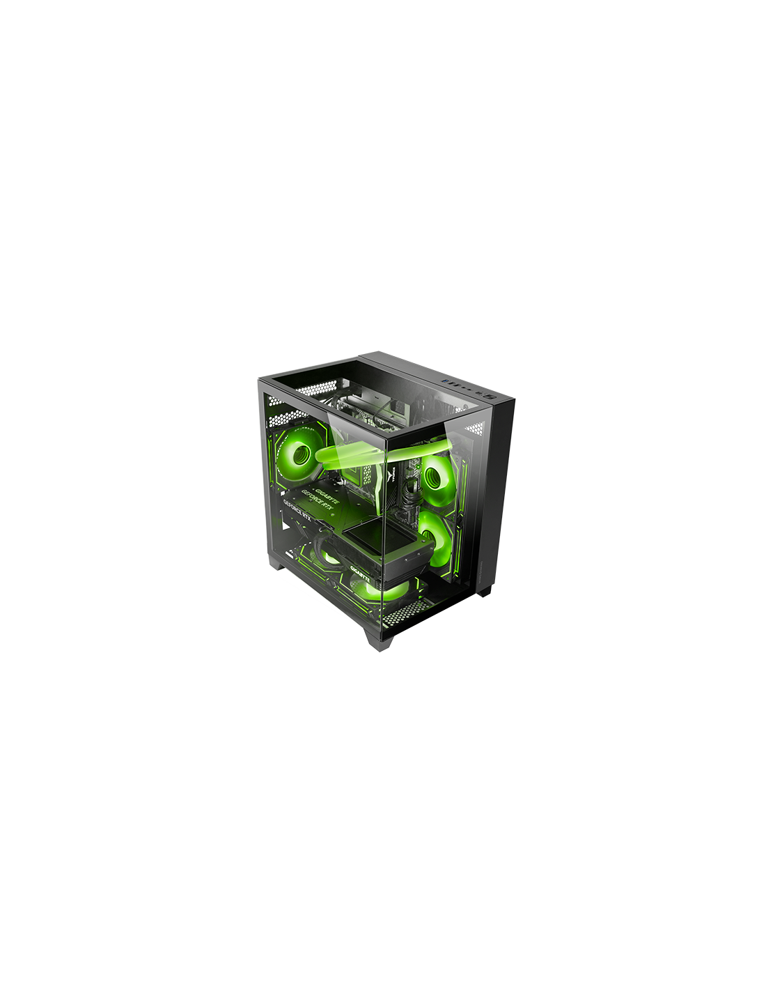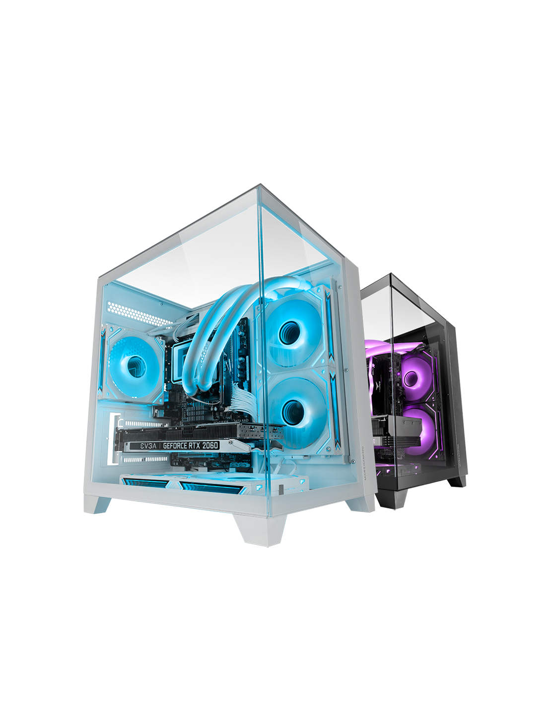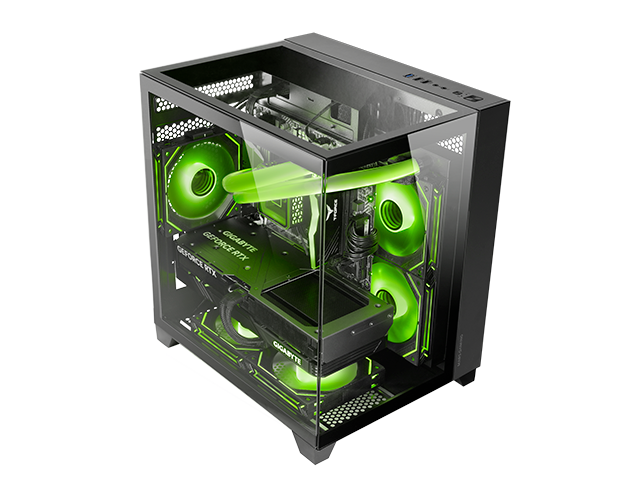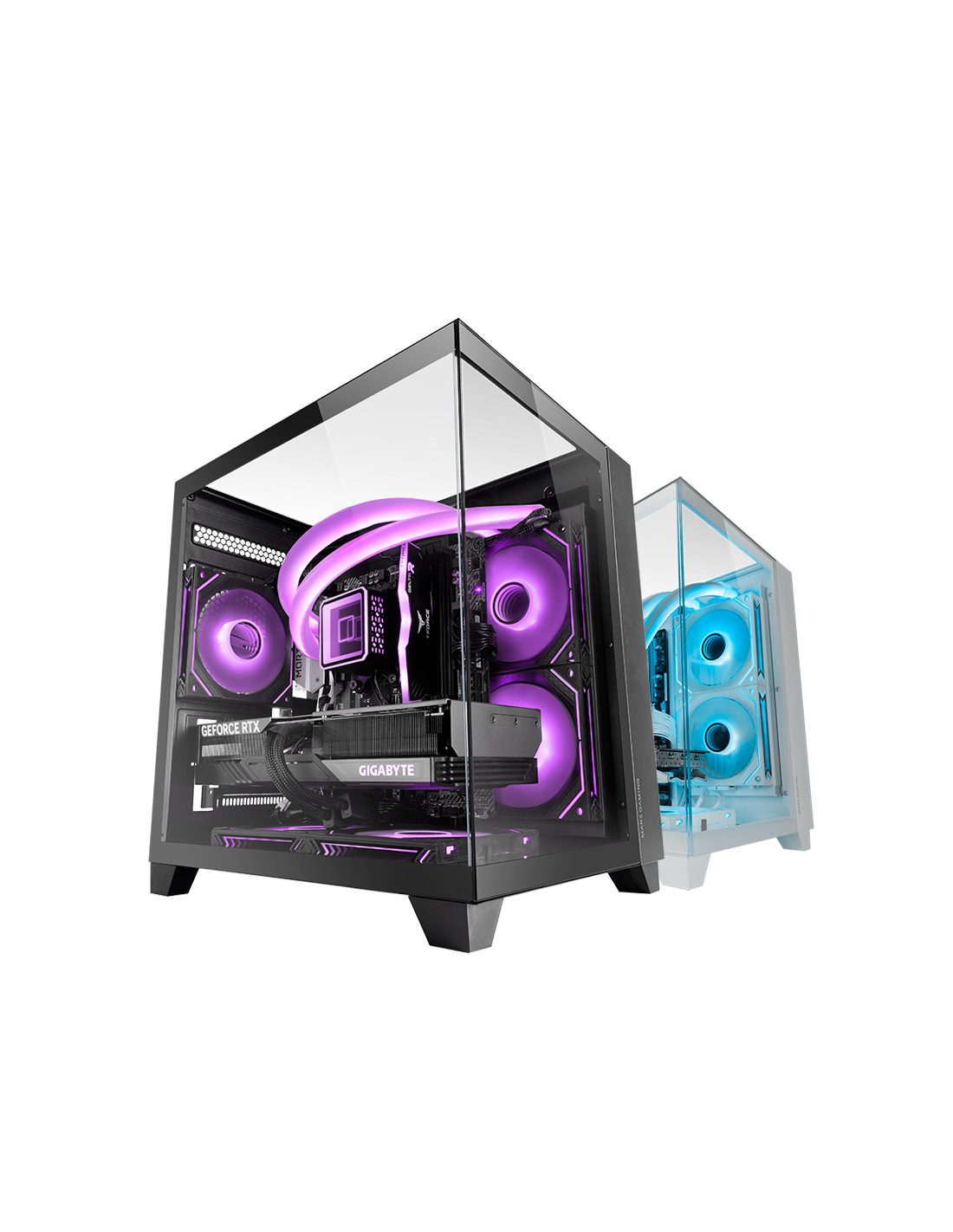 La caja MC-3CM combina un diseño y rendimiento. Su vista panorámica 3D con triple ventana superior, lateral y frontal de cristal templado no solo muestra el interior de tu setup, sino que también ofrece un toque moderno y elegante. Con soporte para refrigeración líquida de hasta 240mm y hasta 5 ventiladores de 120 mm, cuenta con un diseño de doble cámara lateral y una eficiente gestión de cableado que garantizan un interior limpio y ordenado, optimizando el flujo de aire y la estética de tu PC.