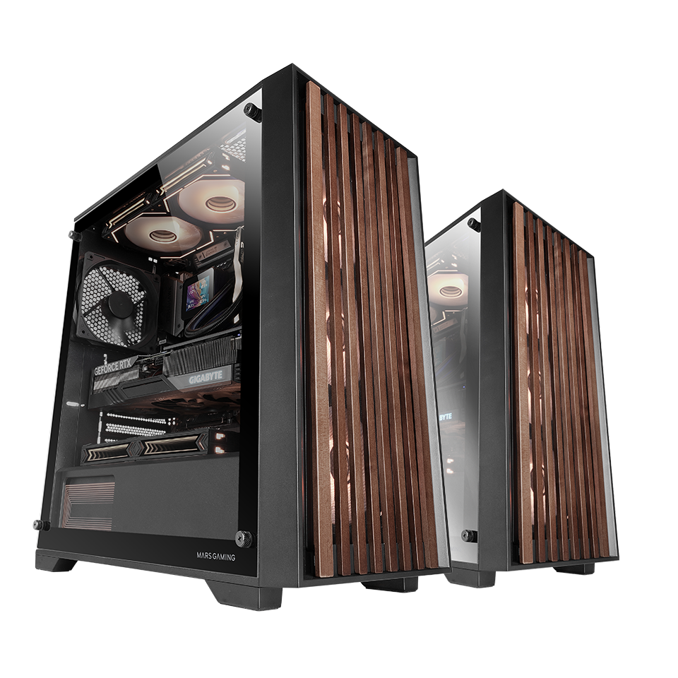 La MC-WOOD combina materiales naturales y tecnología de vanguardia en un diseño que equilibra estética y funcionalidad. Su exclusivo frontal de madera auténtica, complementado con una estructura metálica de finas líneas, aporta un carácter único y elegante a cualquier configuración. Equipada con un ventilador FDB de 120mm ultra silencioso y soporte para refrigeración líquida de hasta 360mm, garantiza un rendimiento térmico eficiente desde el primer momento, manteniendo tu equipo siempre fresco y silencioso. Disponible con panel lateral en cristal templado, para resaltar cada detalle de tu configuración, o cristal cromado, para un acabado moderno, la MC-WOOD se adapta a tu estilo.