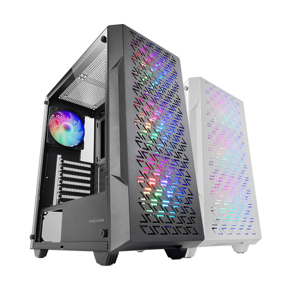 Con panel frontal Mesh geométrico, 4 ventiladores FRGB Rainbow de 120mm de serie, ventana lateral de cristal templado, soporte para refrigeración líquida de hasta 360mm y un diseño de doble cámara, la caja de ordenador MC-GEO fusiona potencia y estilo en una torre ATX diseñada para maximizar la refrigeración y el rendimiento.