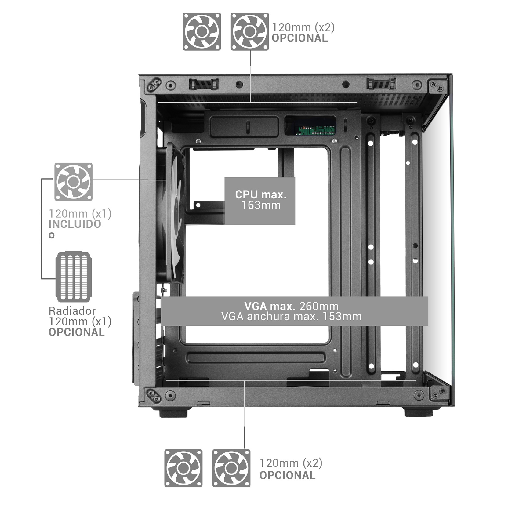 La MC-CUBE lleva el concepto de caja compacta a otro nivel con un diseño tipo cubo. Equipada con 1 ventilador trasero ARGB de 120 mm con múltiples efectos de iluminación predefinidos y cable de sincronización ARGB y cristal templado continuo en el frontal y el lateral, la MC-CUBE combina estética y funcionalidad en un chasis pensado para aprovechar al máximo el espacio. Además, ofrece compatibilidad con placas MicroATX y Mini-ITX, soporte para refrigeración líquida de 120mm, capacidad para hasta 5 ventiladores de 120 mm y conectividad USB-C, USB 3.0 y Audio HD.