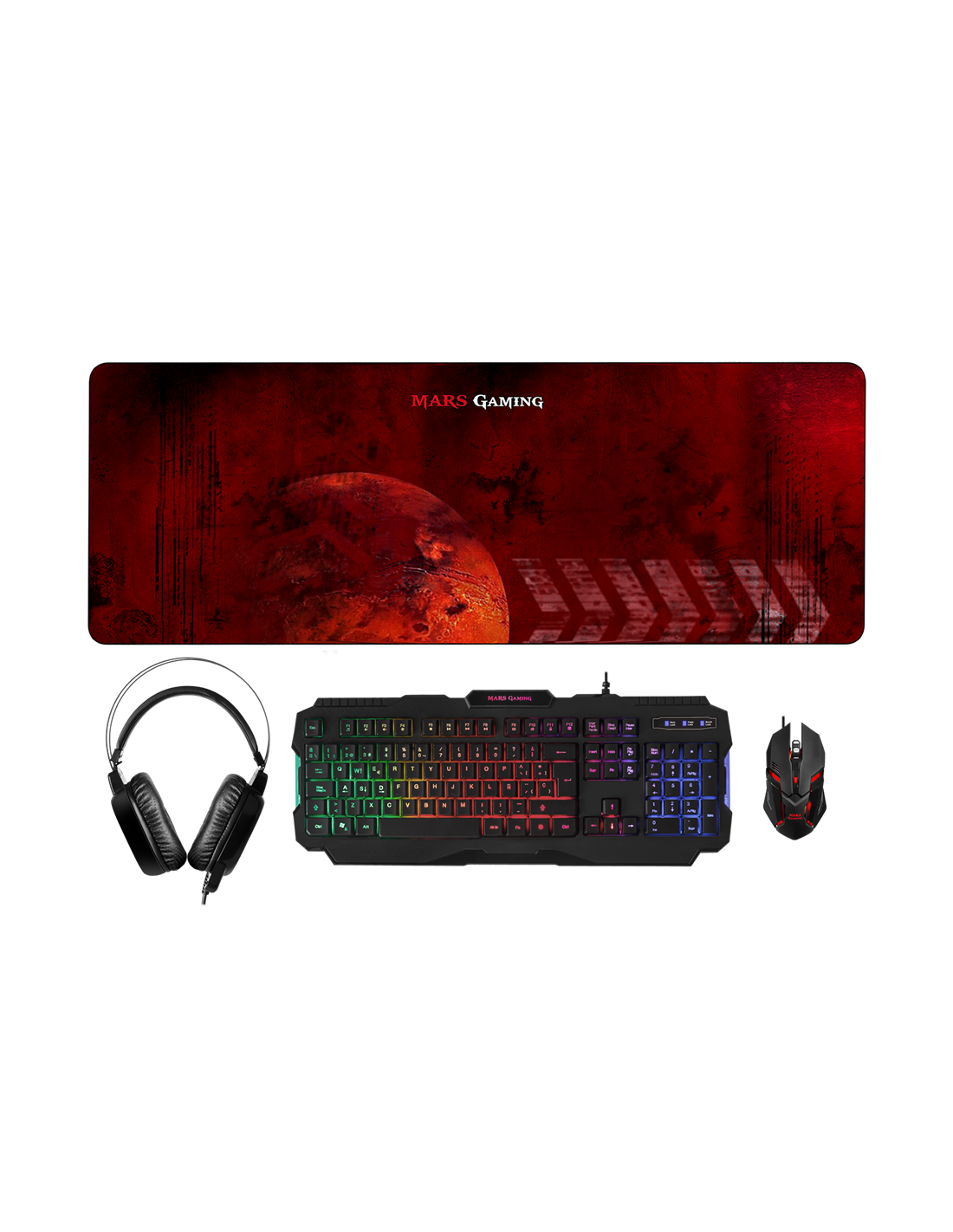 Llena tu escritorio de color con el combo MCPRGB. El teclado RGB Rainbow, el ratón y los auriculares RGB Flow convertirán tus sesiones gaming en un espectáculo de luces. Protege tu teclado y ratón con la alfombrilla XXL con un espectacular diseño en rojo.