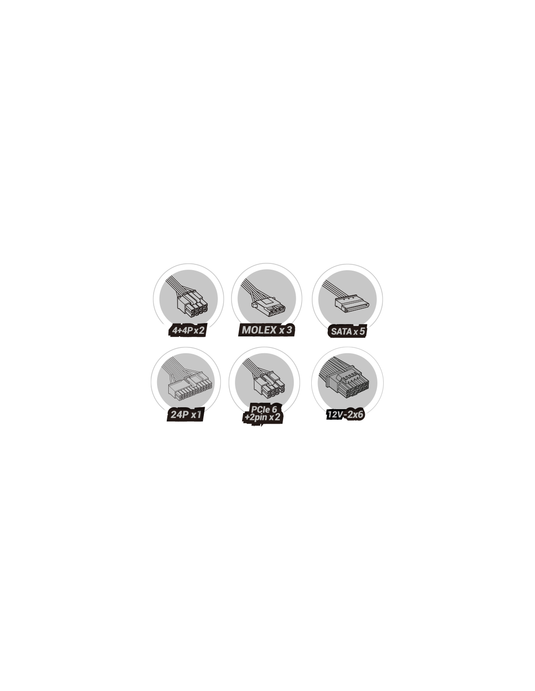 - "· 1x ATX MB 24 PIN · 2x EPS +12V 4+4 PIN · 2x PCIe 6+2 PIN · 5x SATA · 3x Molex 4 PIN · 1x 12V 2x6 PIN"