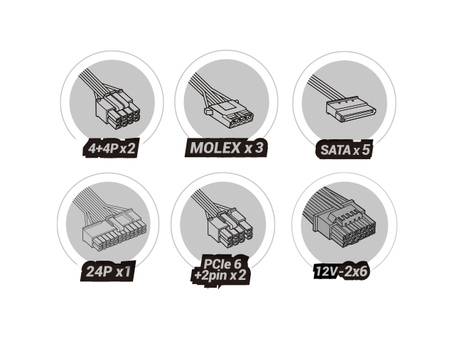 - "· 1x ATX MB 24 PIN · 2x EPS +12V 4+4 PIN · 2x PCIe 6+2 PIN · 5x SATA · 3x Molex 4 PIN · 1x 12V 2x6 PIN"