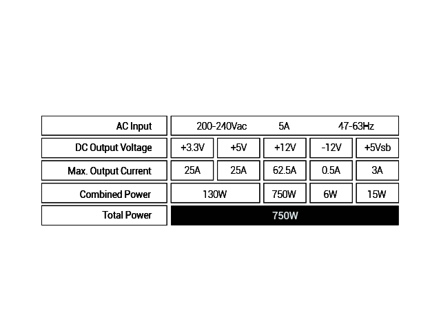 - +3.3V - 25A / +5V - 25A / +12V - 62.5A / -12V - 0.5A / +5VSB - 3A