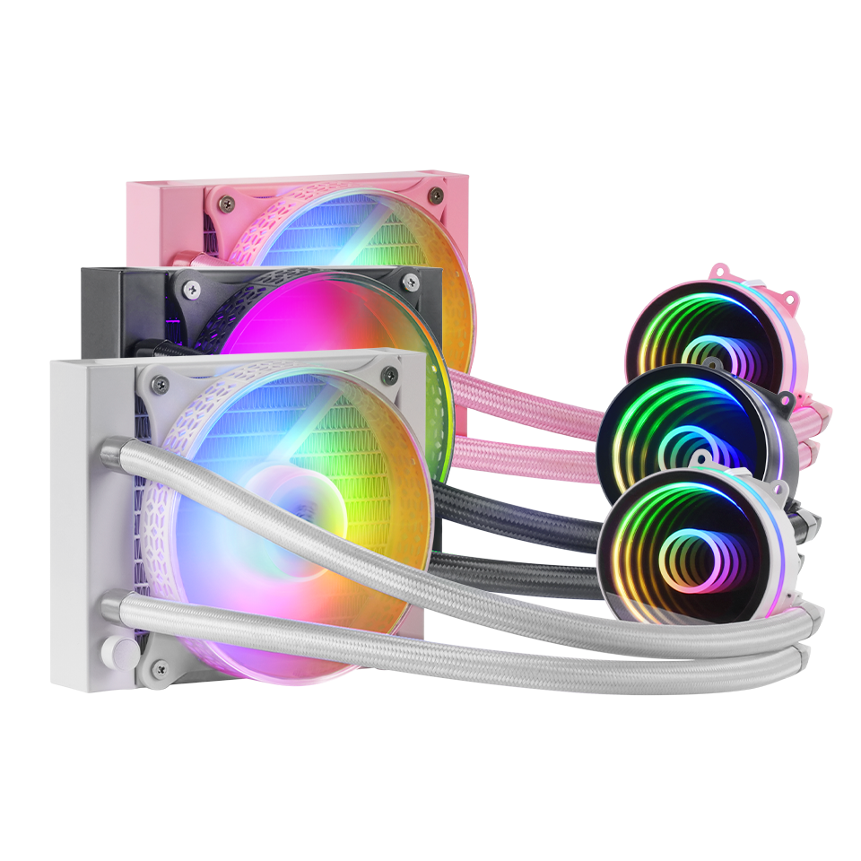 Espejo infinito FRGB y un rendimiento excepcional en sistemas de refrigeración líquida con una extraordinaria potencia de hasta 200W. Nueva bomba OPTI-CHAMBER, ventilador silencioso FDB FRGB, radiador de baja resistencia y compatibilidad universal