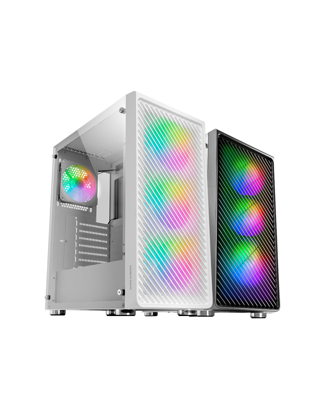 4 ventilateurs ARGB standard pour PC de performance extrême, fenêtre en verre trempé, support complet pour le refroidissement liquide et panneau frontal en METAL-MESH avec un design aérodynamique qui améliore son apparence en combinant refroidissement et éclairage.