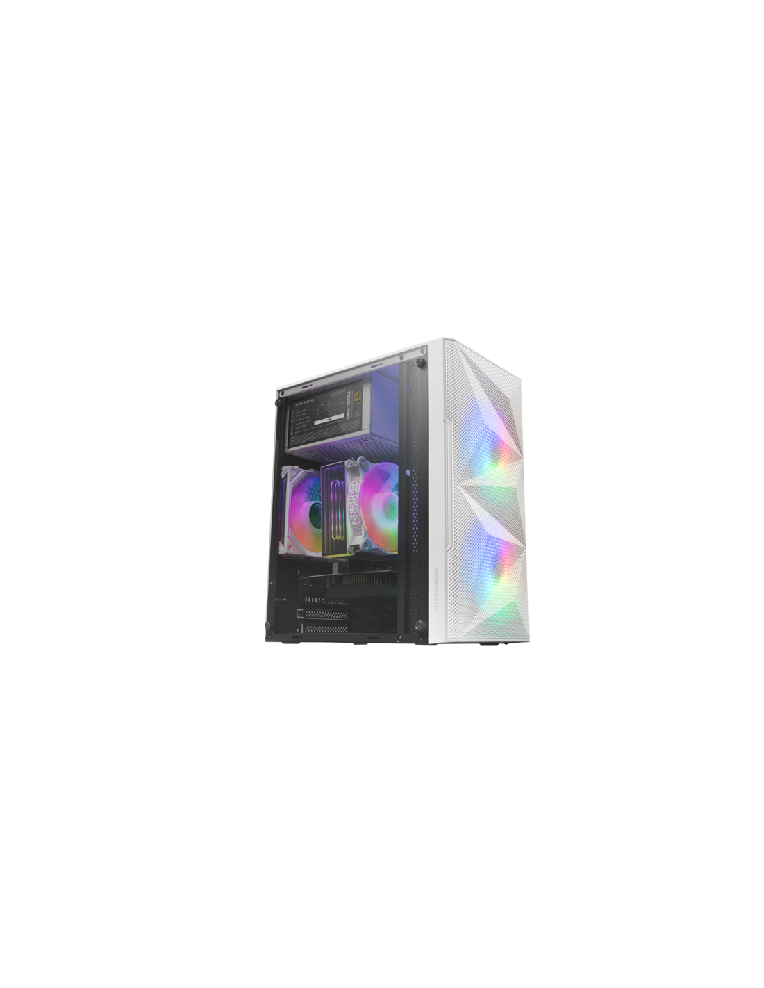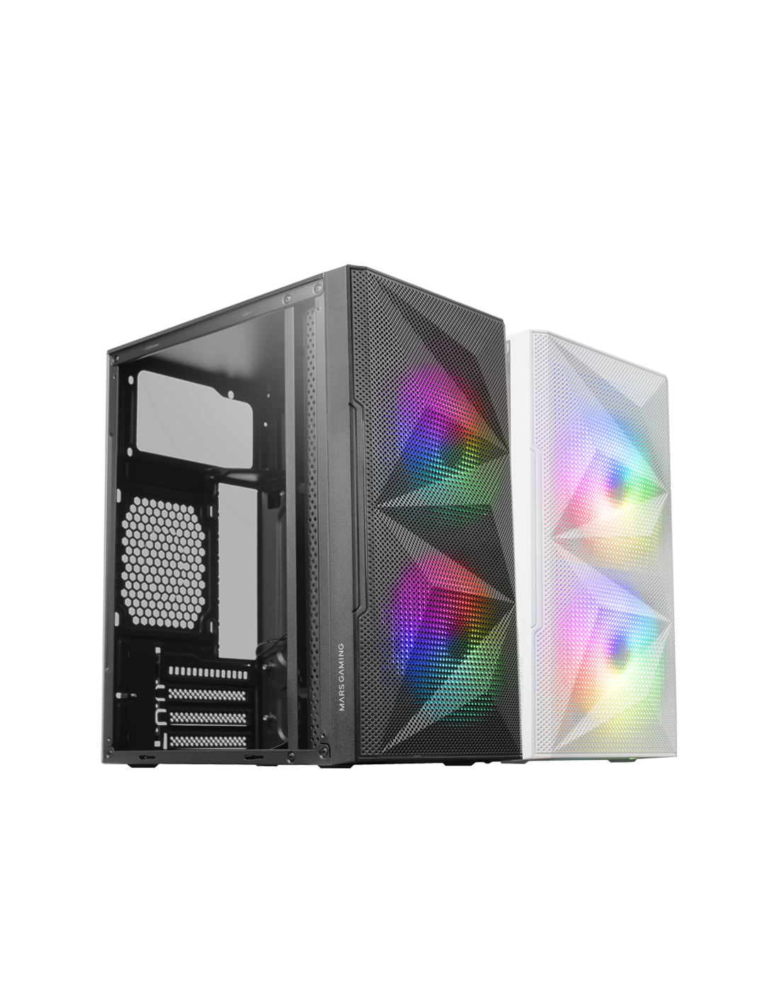 Design innovant avec grille totale-MESH au design géométrique qui renforce l'esthétique et la performance, ainsi qu'une fenêtre latérale totale en verre trempé. Configurations de jeu haute performance au format MicroATX et Mini-ITX. 2 ventilateurs fixes RGB à l'avant et support pour refroidissements liquides.