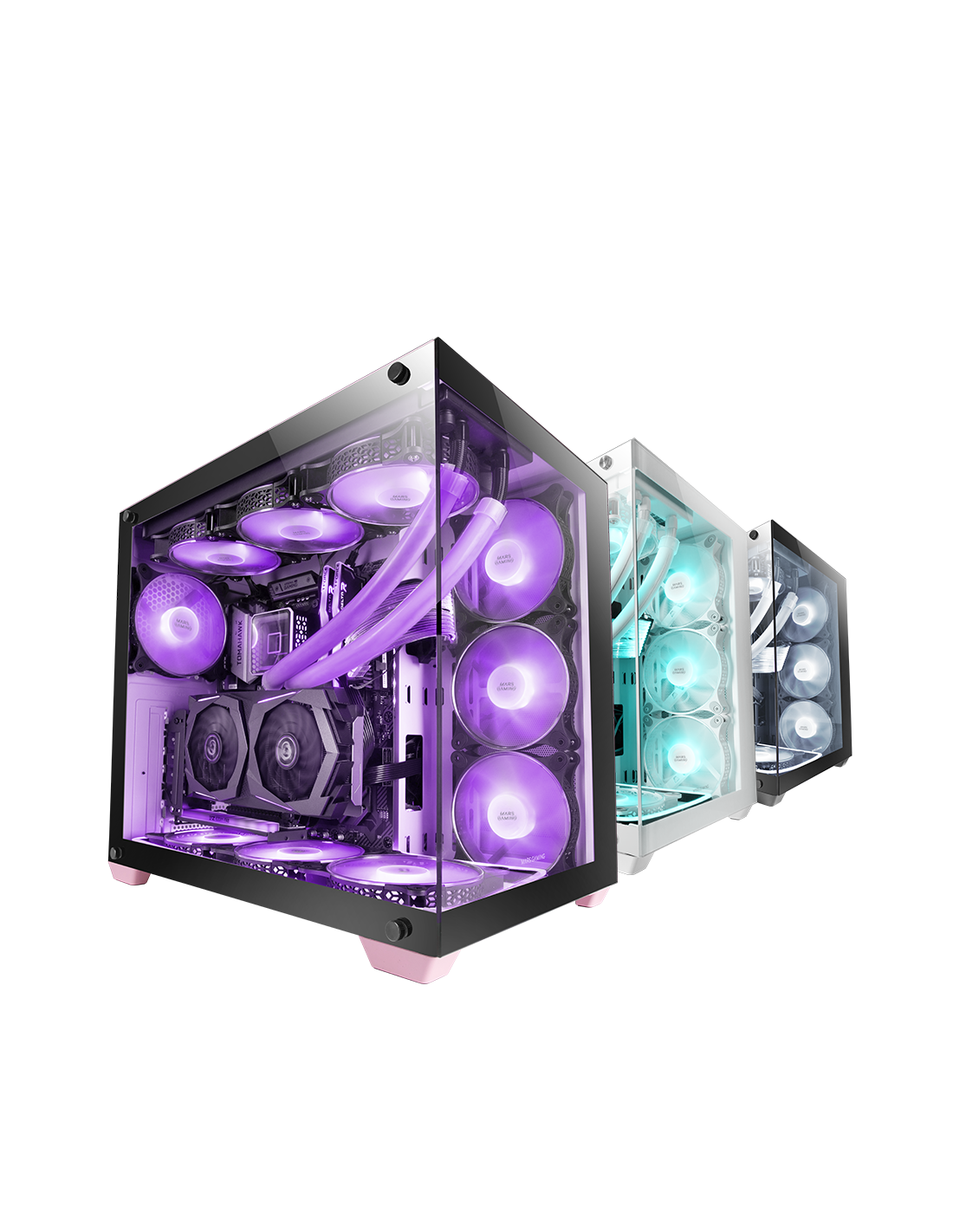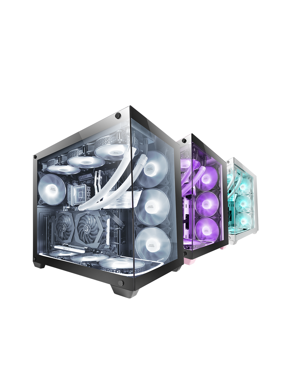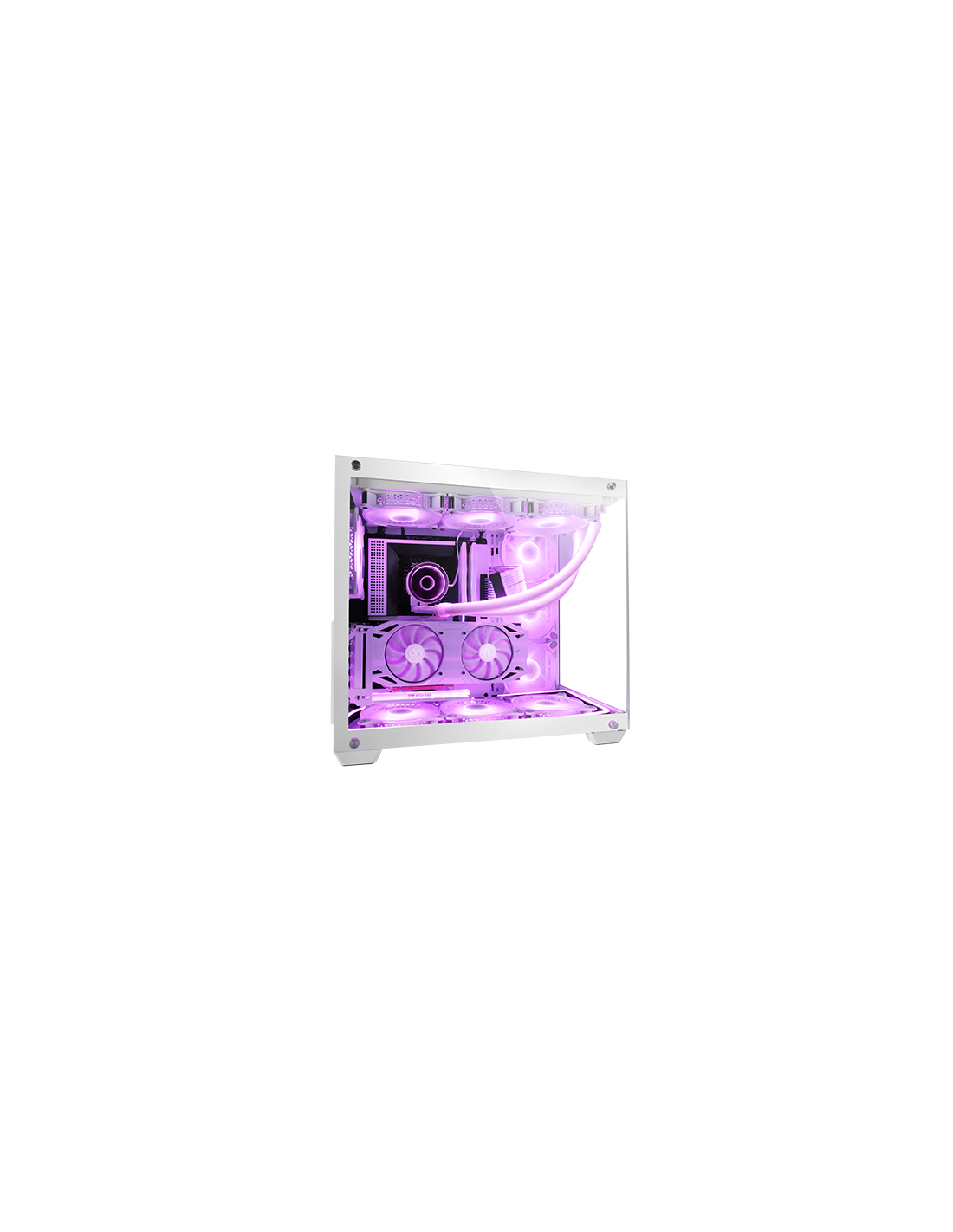 Verre trempé continu sans cadre, taille XXL E-ATX pour les configurations les plus exclusives. Avec support pour jusqu'à 10 ventilateurs et triple refroidissement liquide dans diverses positions.