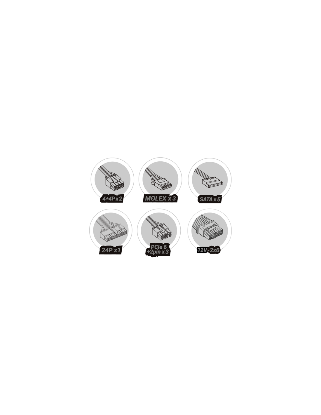 - · 1x ATX MB 24 PIN · 2x EPS +12V 4+4 PIN · 3x PCIe 6+2 PIN · 5x SATA · 3x Molex 4 PIN · 1x 12V 2x6 PIN