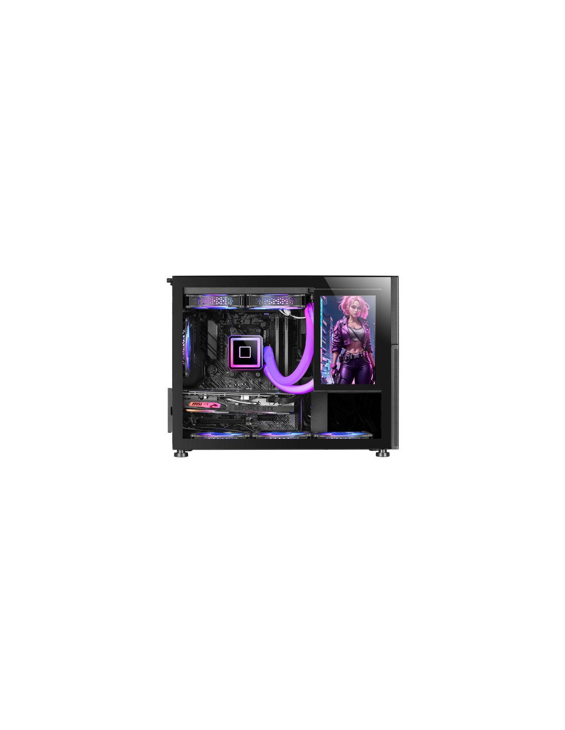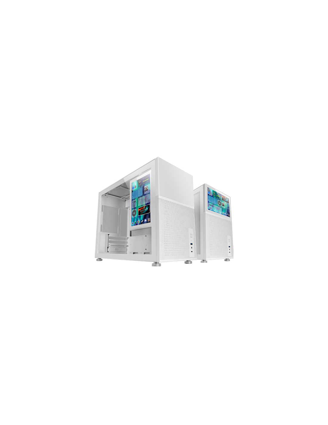 La scatola del computer MC-LCD porta il gaming e la produttività a un altro livello, combinando un design Micro-ATX compatto ed elegante con una robusta costruzione in acciaio e un design a rete che garantisce un flusso d'aria ottimale. Il suo schermo LCD IPS da 8 pollici e ad alta risoluzione apre un mondo di possibilità per la personalizzazione e il multitasking. Equipaggiata per ospitare i più avanzati sistemi di raffreddamento liquido e le ultime schede grafiche, questa scatola non fa economia sulla connettività con porte USB 3.0, Audio HD e USB-C. Inoltre, si distingue per il suo ampio spazio di archiviazione e le opzioni di espansione, rendendola una scelta perfetta in termini di capacità e funzionalità.