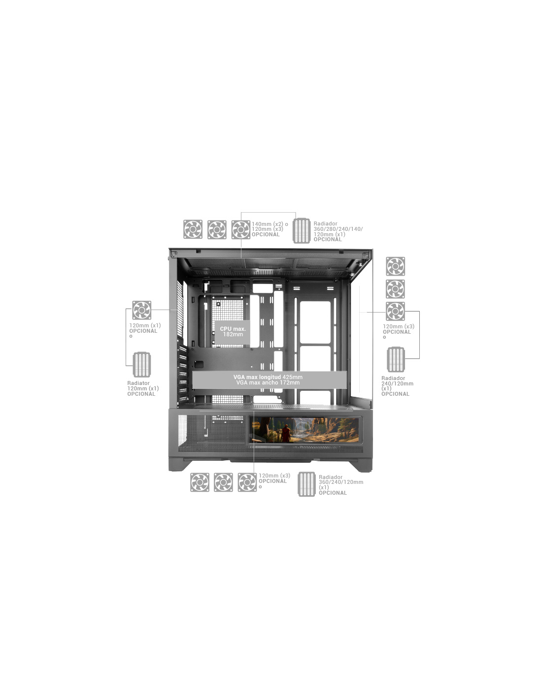 Scopri la MC-LCDX, un case ATX che ridefinisce la tua configurazione con una combinazione unica di avanzata funzionalità e tecnologia integrata. Dotata di un'impressionante schermo IPS da 9,16" con connessione HDMI, pannelli in vetro temperato frontale e laterali continui e supporto totale per il raffreddamento a liquido fino a 360 mm e pannello inferiore FULL MESH, questa torre è progettata per spiccare visivamente e per fornire le prestazioni di massimo livello.