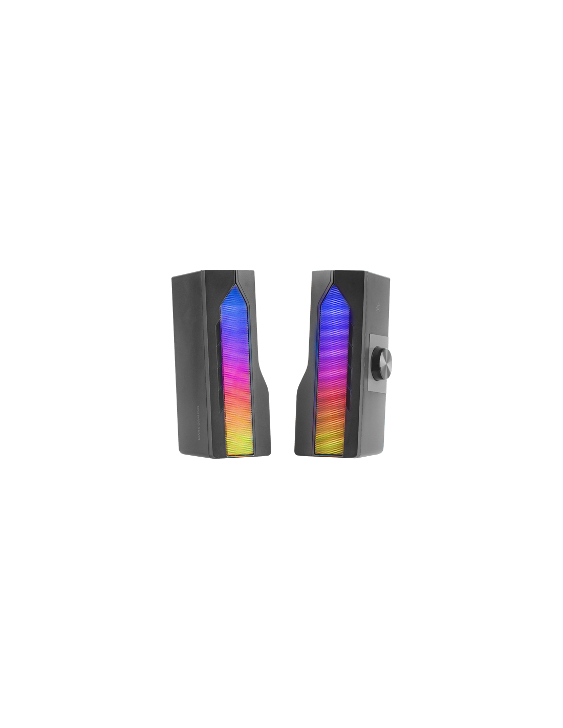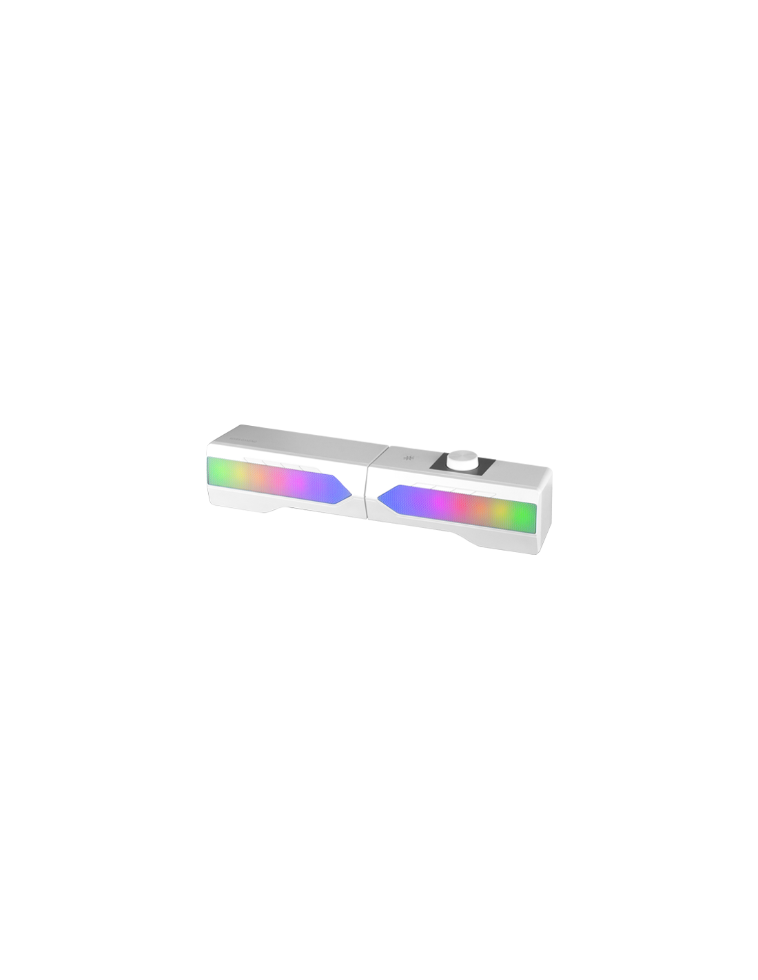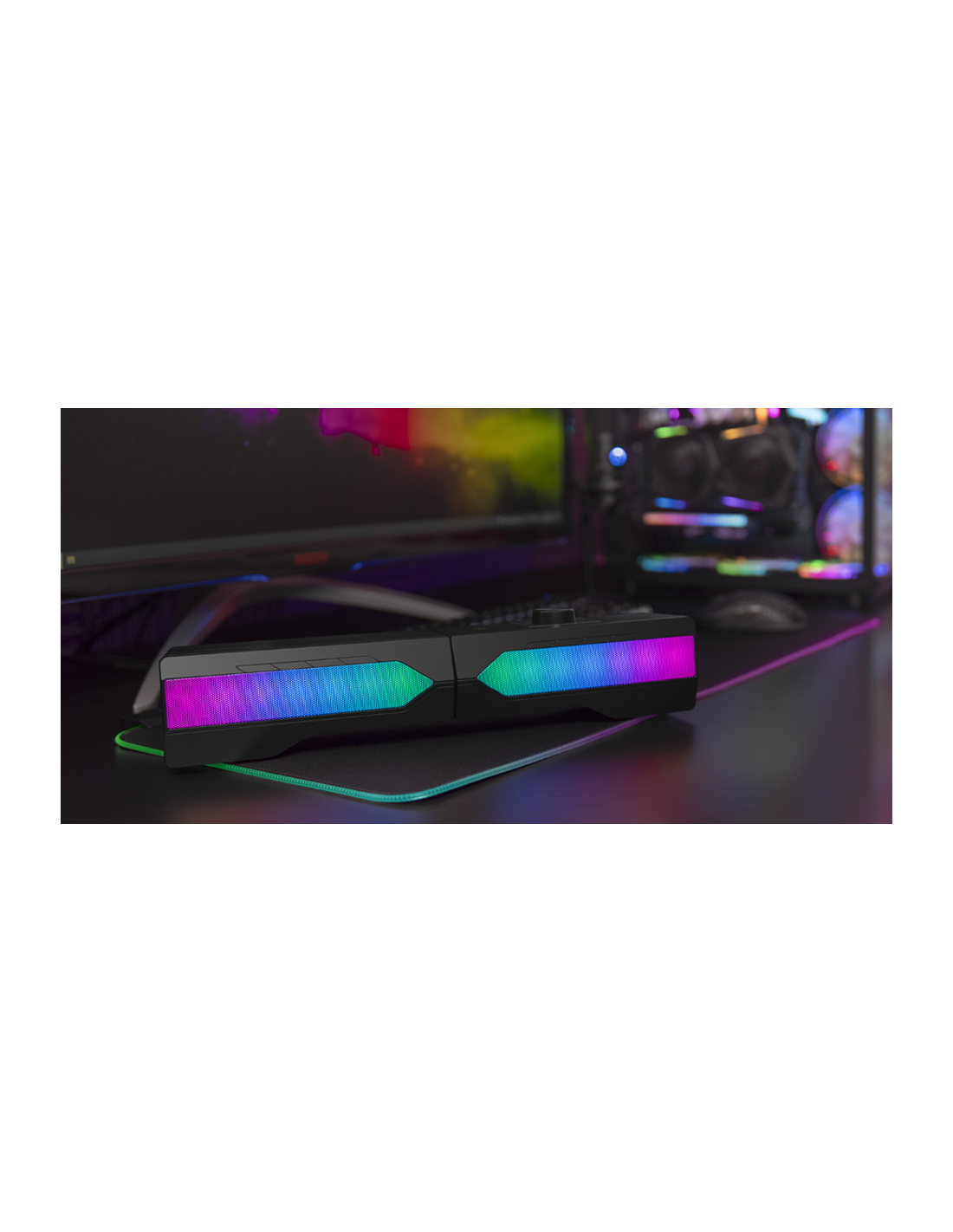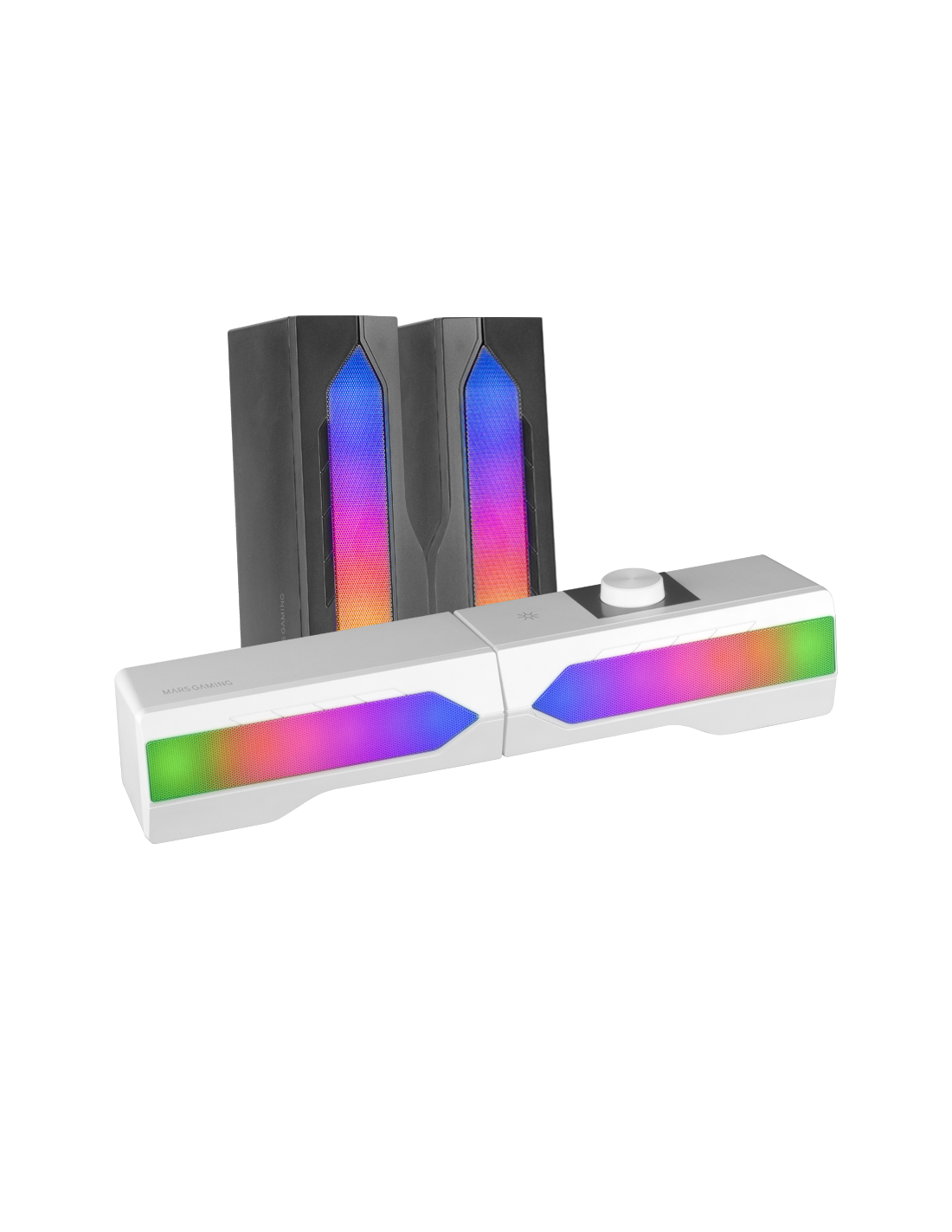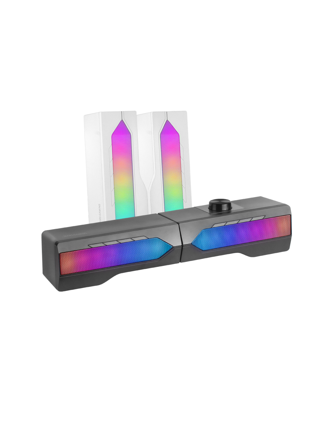 2 em 1: soundbar ou alto-falantes 2.0. Você escolhe. Máximo espetáculo com o sistema RGB MESH, processador de som avançado DSP com espacialidade multinível e graves aprimorados, conectividade total jack + Bluetooth 5.0 e um sistema de controle conveniente.