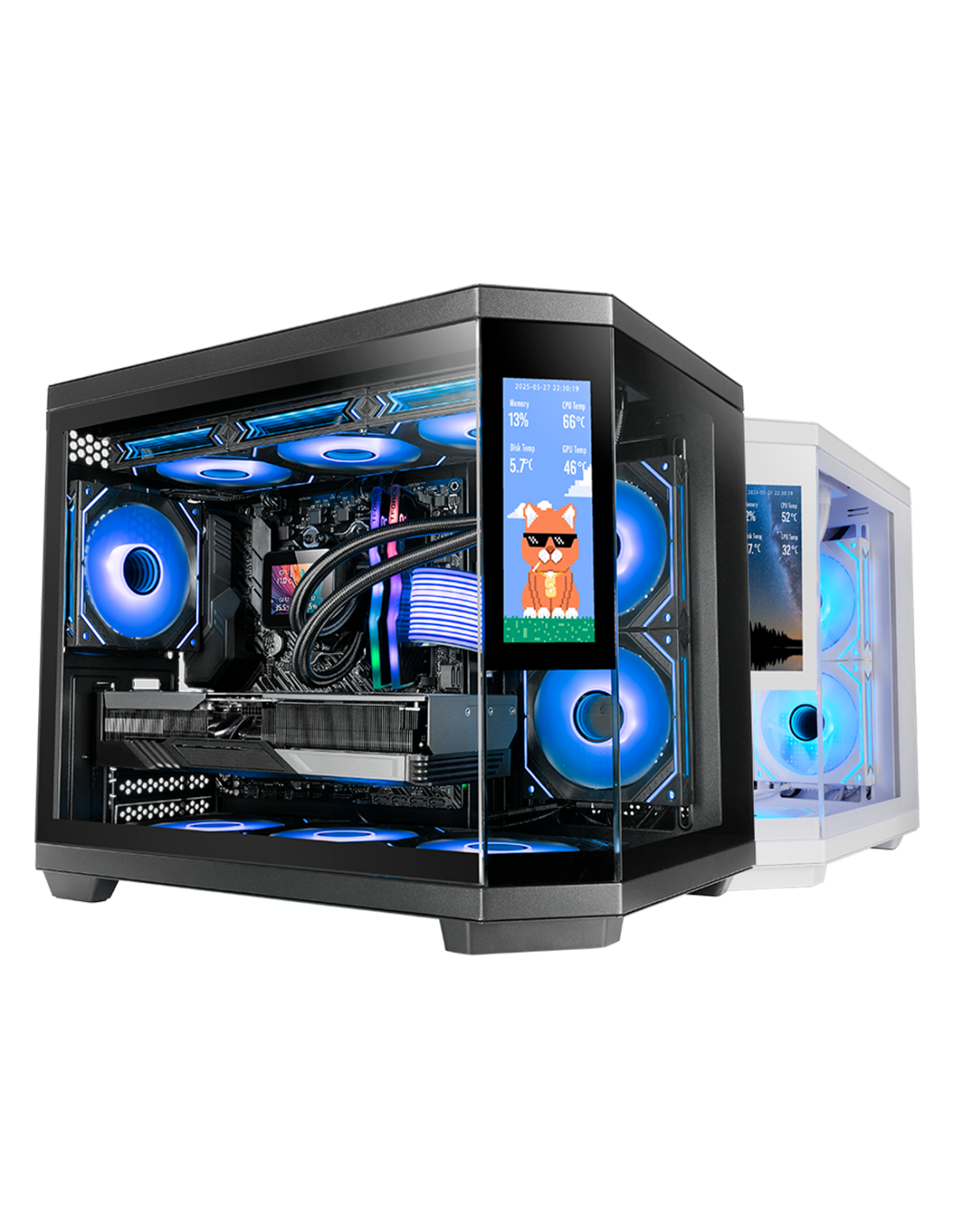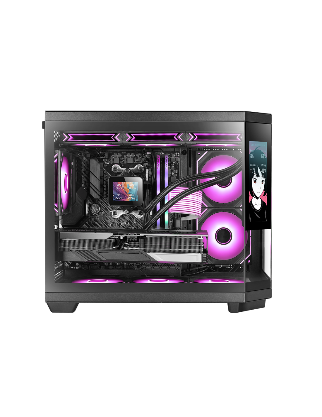 Potência e estilo em formato compacto. O MC-3TCORELCDM leva a experiência CUSTOM para as mesas que valorizam o espaço, com um ecrã IPS de 7,2” integrado no vidro central, triplo vidro temperado e duas câmeras. Preparada para até 9 ventoinhas ou líquida de 360 mm, é perfeita para montar um PC Micro-ATX com presença e capacidade de topo de gama.