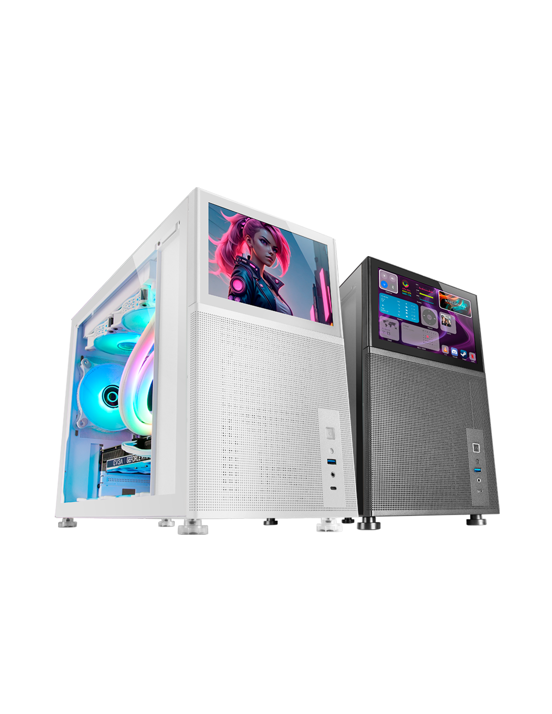 A caixa de computador MC-LCD eleva o gaming e a produtividade a outro nível, combinando um design compacto Micro-ATX sofisticado com uma construção robusta em aço e um design Mesh que garante um fluxo de ar ótimo. Seu ecrã LCD IPS de 8 polegadas e alta resolução abre um mundo de possibilidades para personalização e multitarefa. Equipada para acomodar sistemas de refrigeração líquida avançados e placas gráficas de última geração, esta caixa não poupa em conectividade com portas USB 3.0, Áudio HD e USB-C. Além disso, destaca-se pelo seu amplo espaço para armazenamento e opções de expansão, tornando-a uma escolha perfeita em termos de capacidade e funcionalidade.