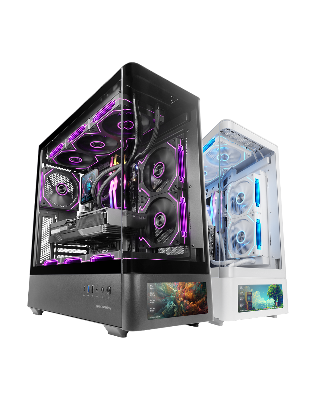 A MC-LCDPRO é uma caixa ATX para jogos criada para apresentar e controlar o seu PC a partir do próprio chassis: ecrã LCD IPS de 7,2" integrado, vidro temperado curvo sem moldura e USB-C de última geração. O seu interior de câmara dupla maximiza a arrumação e o fluxo de ar, com um design panorâmico que transforma a sua configuração numa montra técnica e estética em partes iguais.