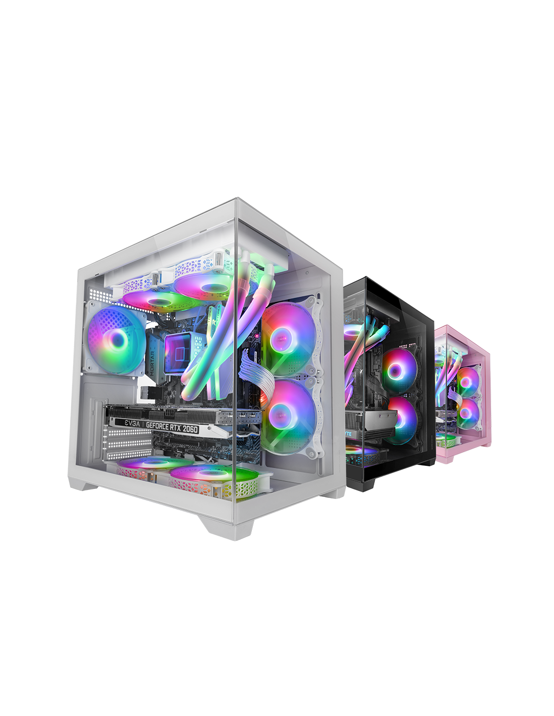A minitorre MC-VIEW2 funde design de vanguarda e recursos avançados num formato compacto. O seu vidro temperado contínuo na frente e lateral proporciona uma visão panorâmica do interior, destacando cada componente com uma estética impecável. Equipada com uma ventoinha traseira FRGB de 120mm pré-instalada, proporciona uma refrigeração eficiente desde o primeiro momento. Além disso, o seu sistema de gestão de cablagem interna, compatibilidade com refrigeração líquida de até 240mm e suporte para até 7 ventoinhas de 120mm garantem um fluxo de ar otimizado, mantendo a tua configuração organizada e eficiente.