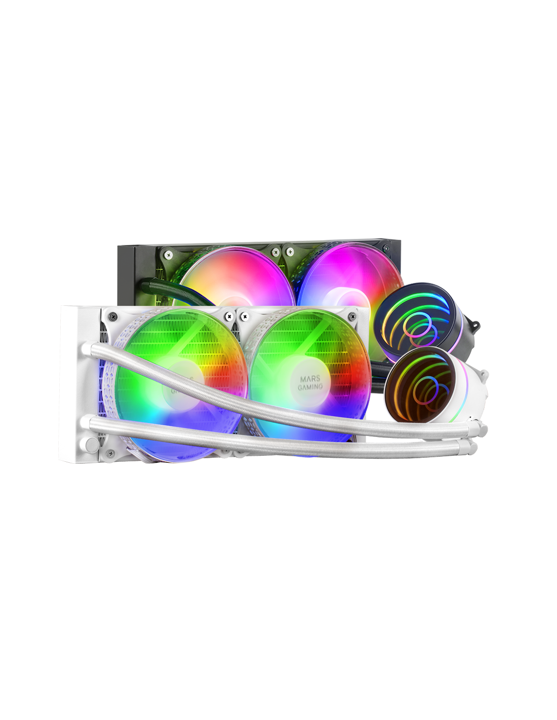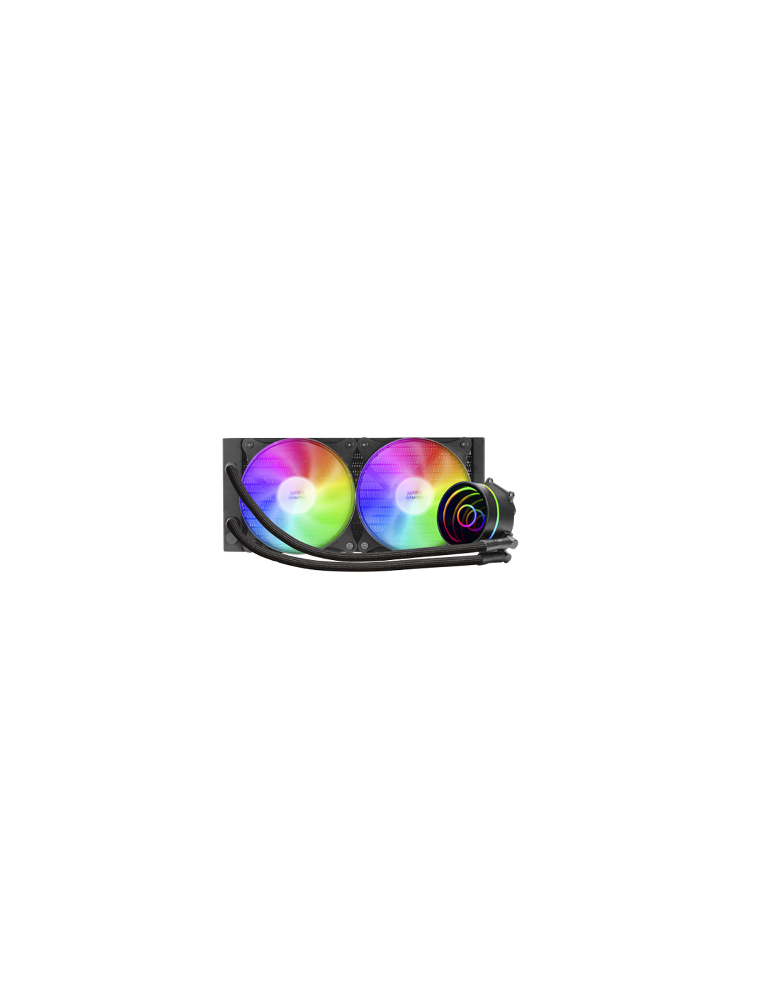 Espelho infinito FRGB e um desempenho excepcional em sistemas de refrigeração líquida com uma potência extraordinária de até 400W. Nova bomba OPTI-CHAMBER, 2x ventiladores silenciosos FRGB FDB, radiador de baixa resistência e compatibilidade universal